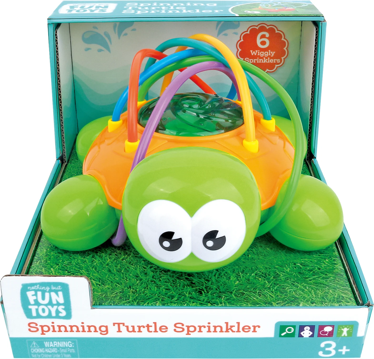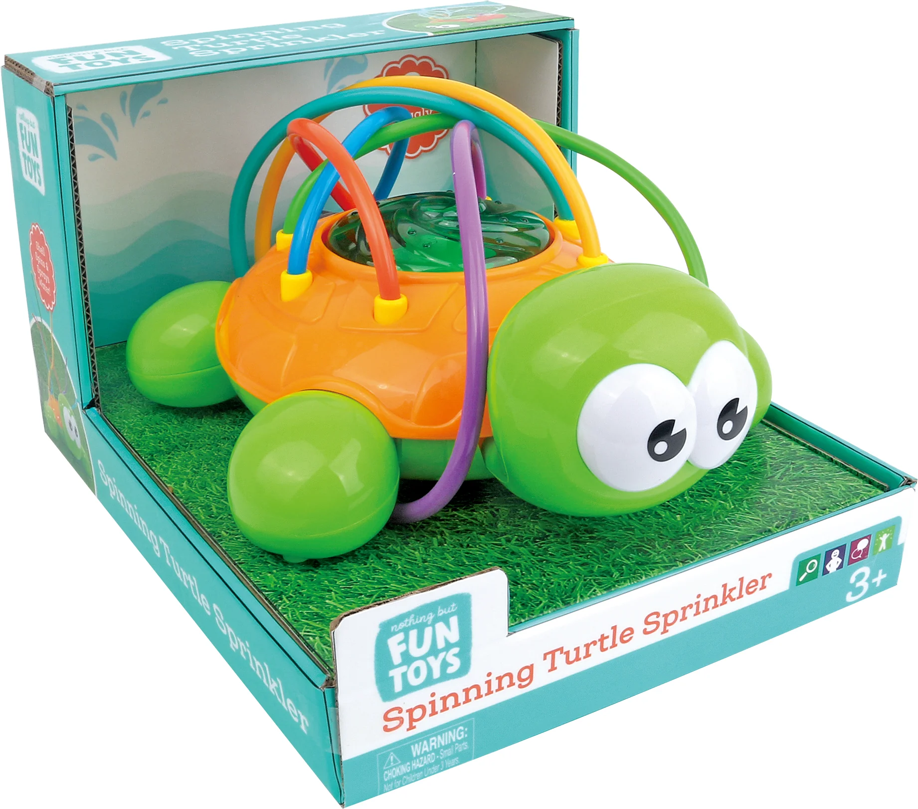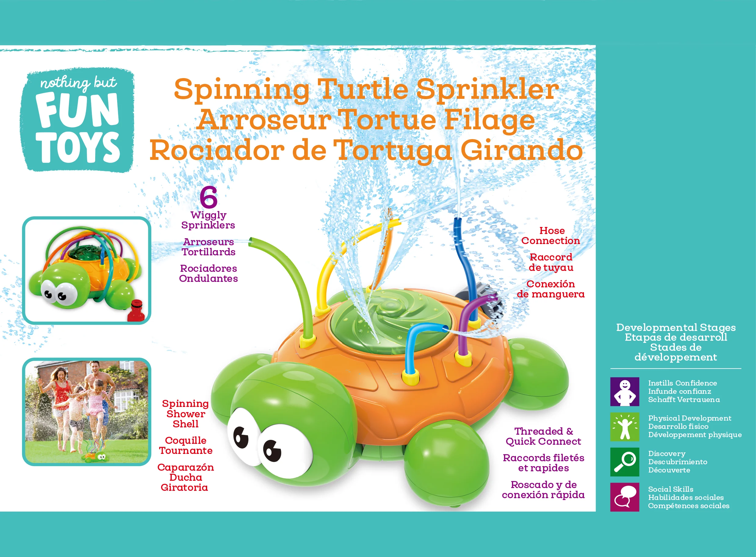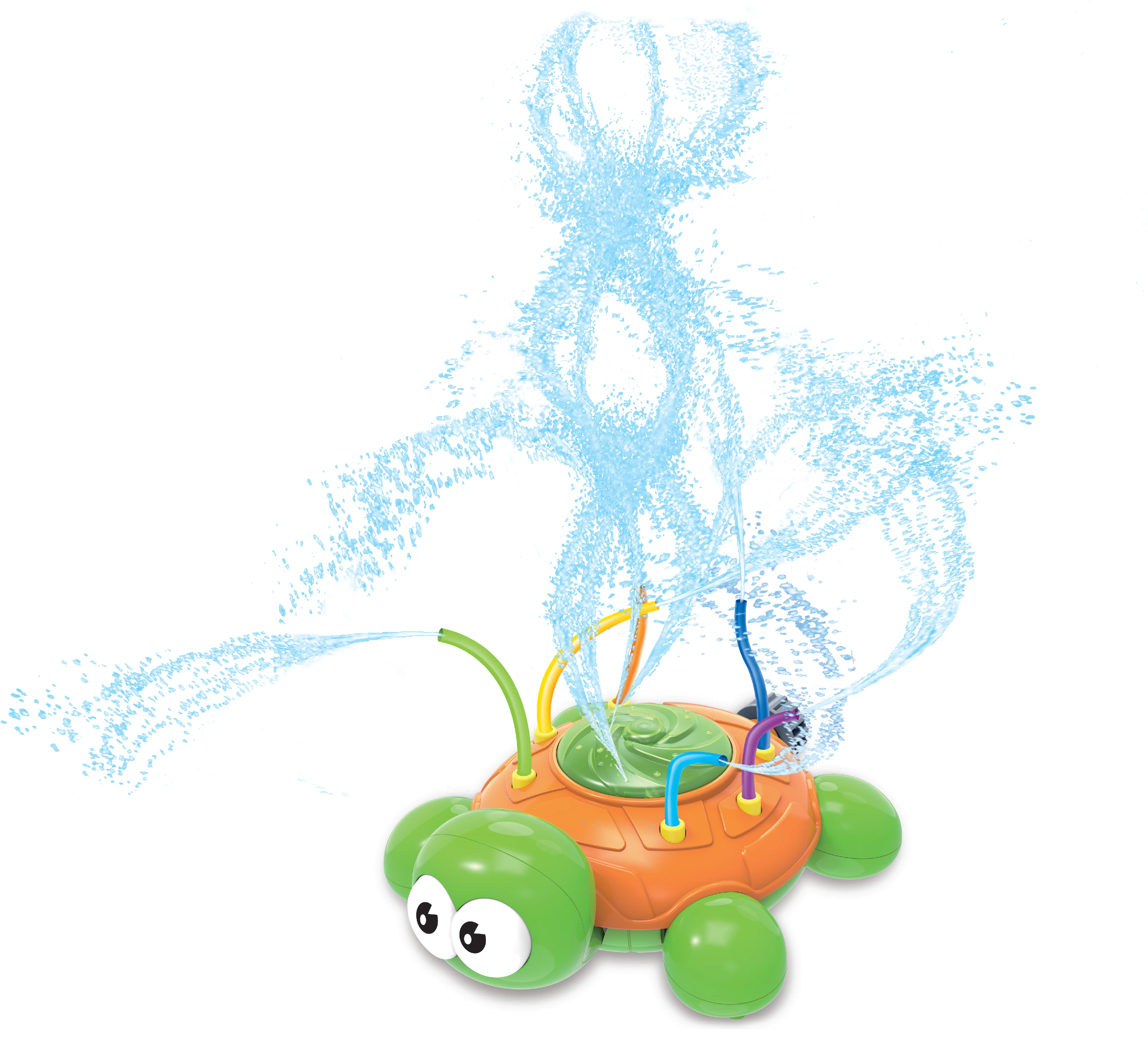 Your little one will adore this brightly colored Spinning Turtle Sprinkler. With 6 wiggly hoses that spray water while the turtle's back spins, kids will never know which direction the water will be coming from next! Sprays up to 8 feet in all directions. No assembly required, the sprinkler attaches easily to any standard garden hose and has a rubber O-Ring to prevent leakage. Spinning Turtle Sprinkler measures 7.9" x 8.2" x 4.2".