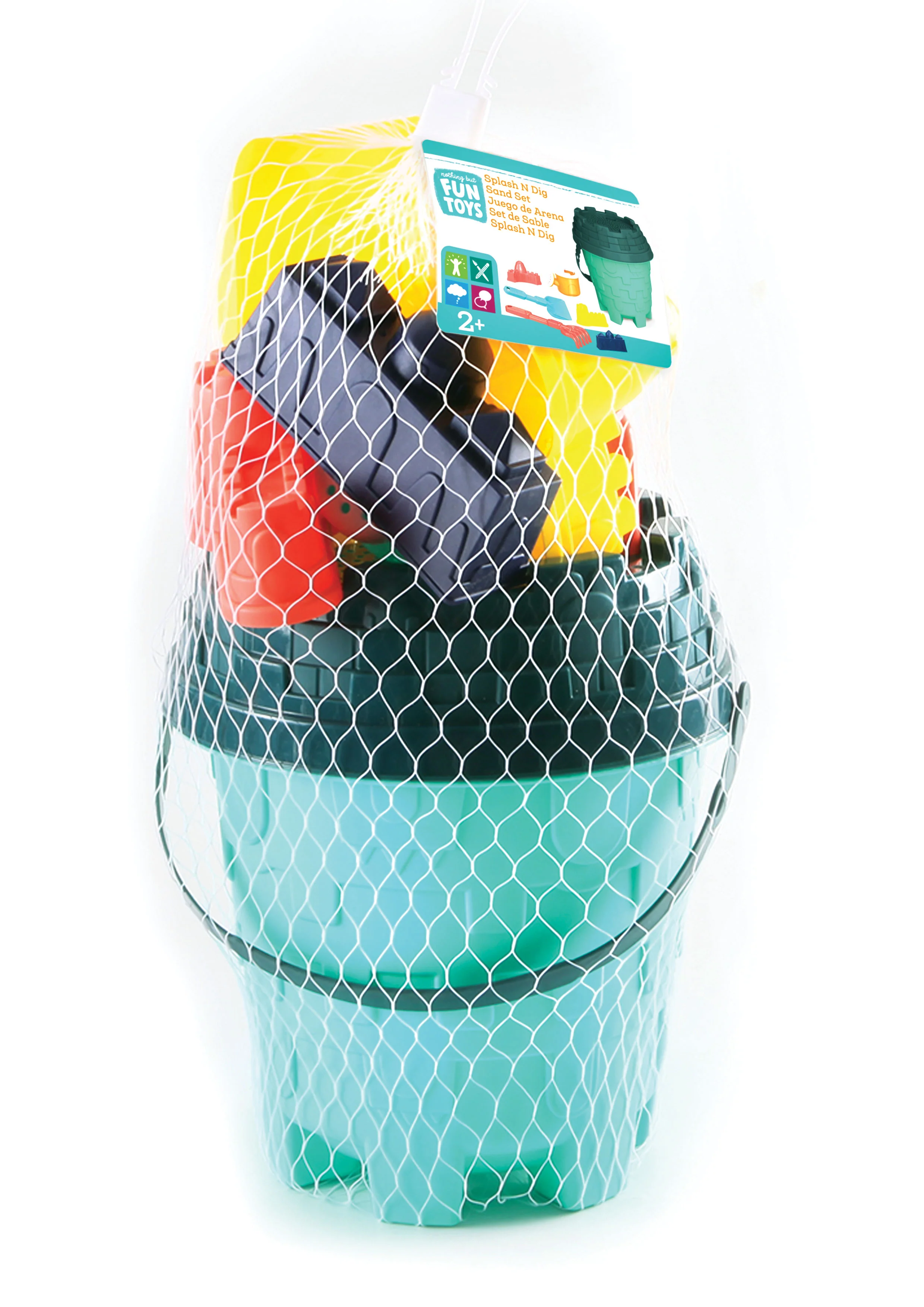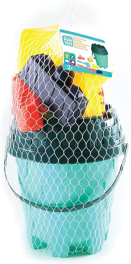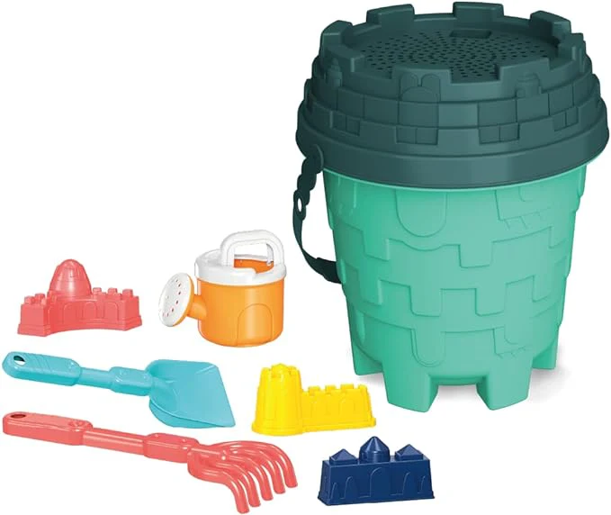 - BEACH PLAYSET INCLUDES: Beach bucket with sifter top, 1 rake, 1 shovel, 1 small watering pail, and 3 small sand castle molds.