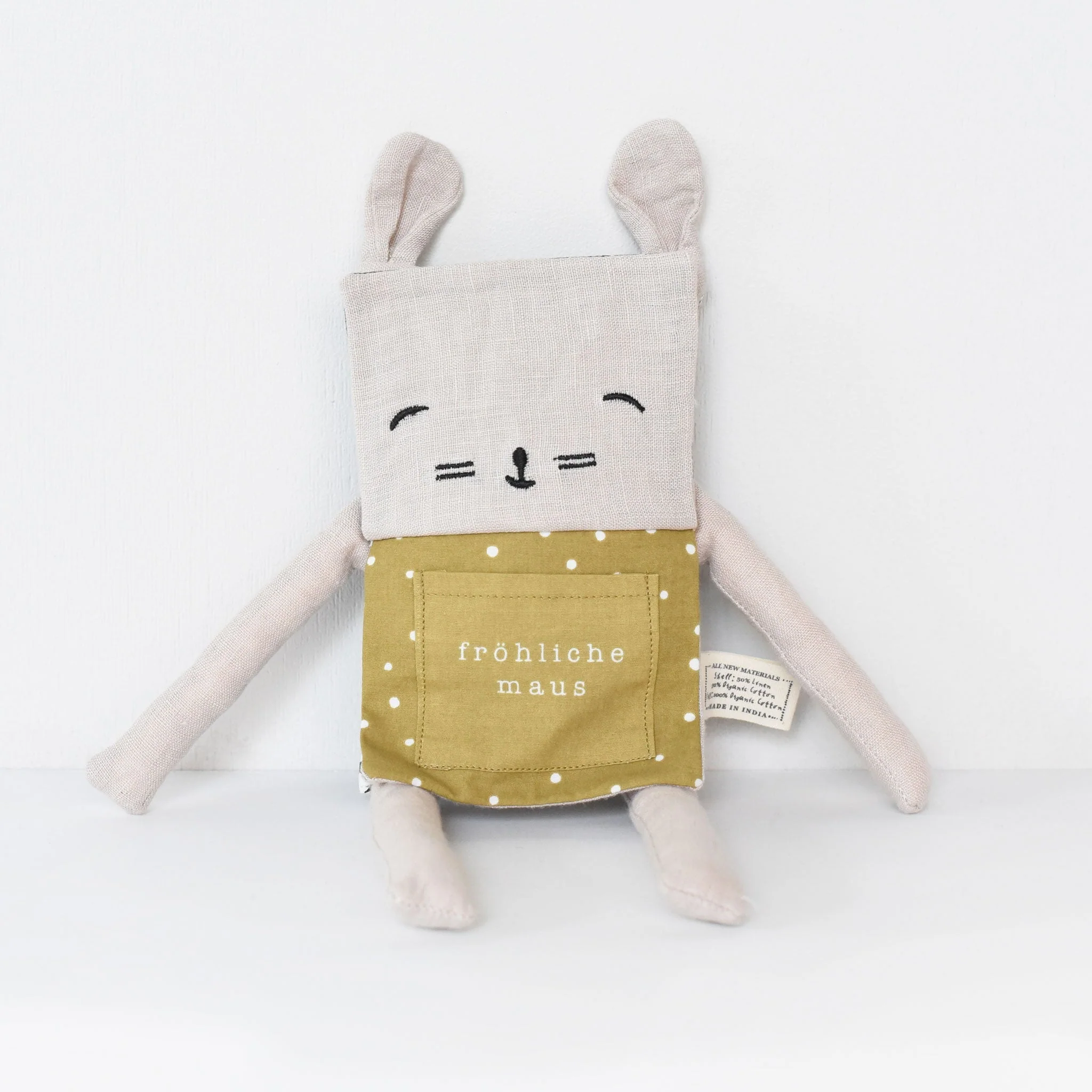 Flip through Mouse's day (in German), from greetings, to lunch, all the way to bedtime with this lovable friend who will stimulate your child's curiosity while following the rhythm and comfort of a daily routine. This clever toy is part cuddle buddy and part flip book with heartwarming faces designed to mirror a toddler's most common feelings and experiences to help them develop their emotional intelligence. Made in India using certified organic fabrics and ethical practices, and arrives in a drawstring linen gift bag/storage bag.