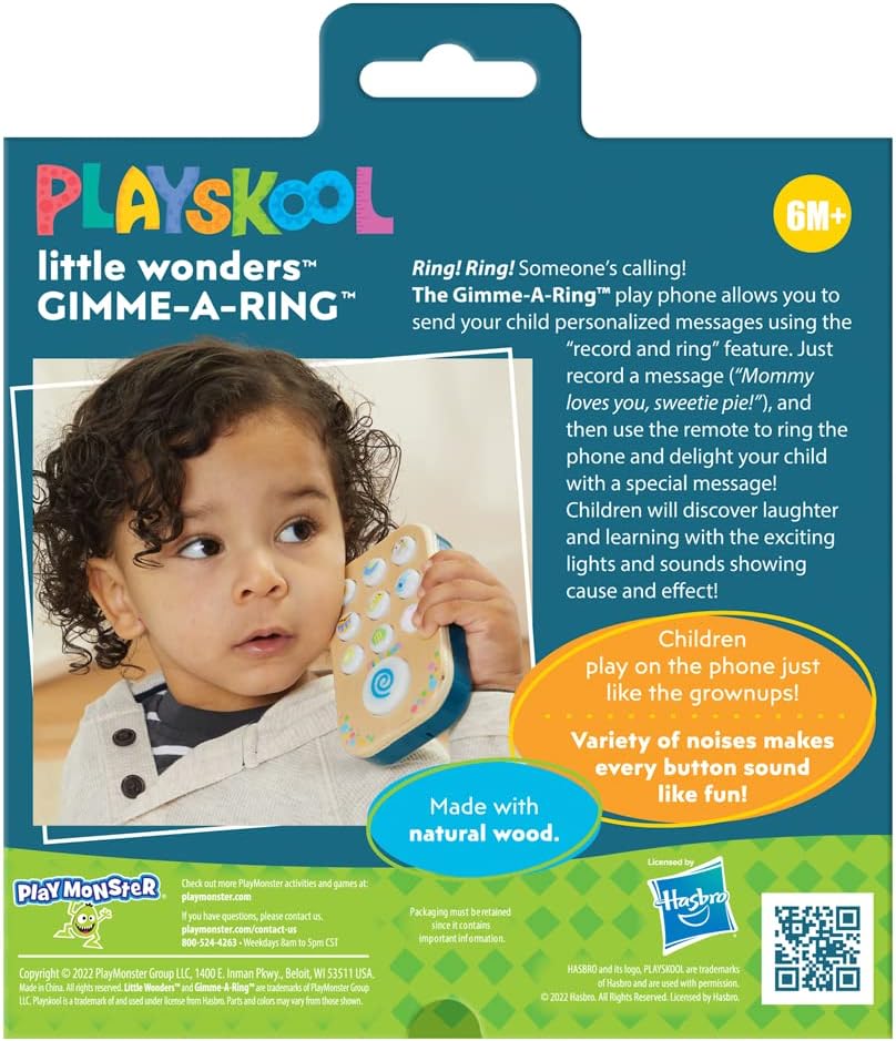 Ring, Ring! Someone's calling! The Gimme-A-Ring play phone allows you to send your child personalized messages using the "record and ring" feature. Just record a message ("Mommy loves you, sweetie pie!") and then use the remote to ring the phone and delight your child with a special message! Children will discover laughter and learning with the exciting lights and sounds showing cause and effect!