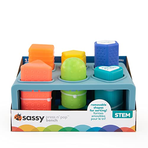 Sassy Press n' Pop Bench has 6 textured shapes fit into a shape-sorting bench. Each column of 2 shapes interact with eachother, push one down and another pops up – teeter-tottering together for endless fun! The shapes are completely removable for shape sorting, and teething for younger babies. The triangle and hexagon have an extra surprise, and have gentle rattle sounds within.