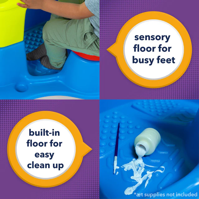 - SENSORY TABLE: This children's unique activity table is conveniently attached to a stool with a rotating active seat and sensory grip points, a textured sensory floor for busy feet, and loads of storage to hold all of your child's items for tactile and creative activities