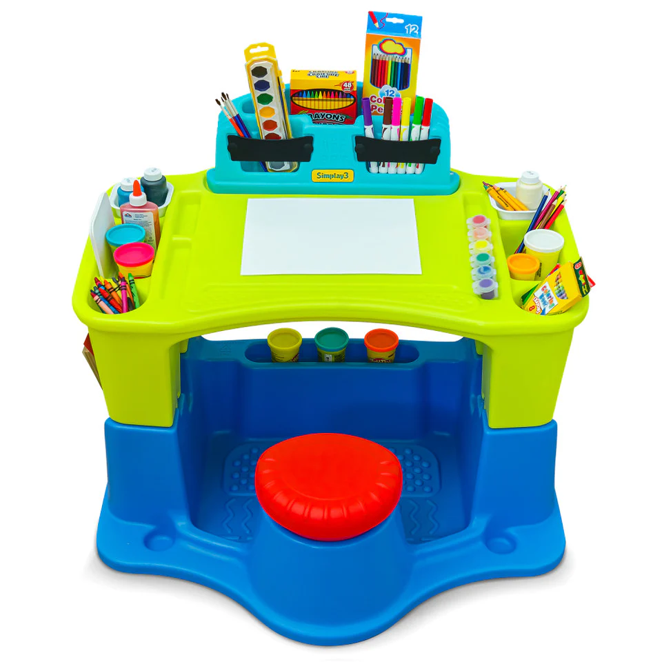 - KIDS ART TABLE AND CHAIR SET: Multi-use kid's desk to use as a creative art table, craft table, sensory table, study desk or even for snack time. Attached desk chair and full floor keep it all together and contain the mess
