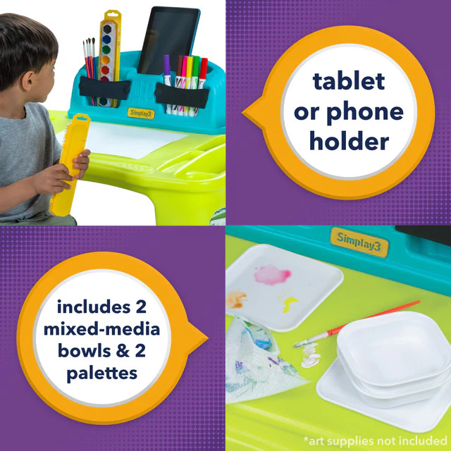 - ART SUPPLY STORAGE: Kids desk can be used to hold supplies for crafts, sensory activities, artwork, study or even snack time, all in one place! Use the 2 multi-use, mixed media bowls and 2 paint palettes (included), and special organizers for markers, tablets, coloring books, paints, paint mixing and more