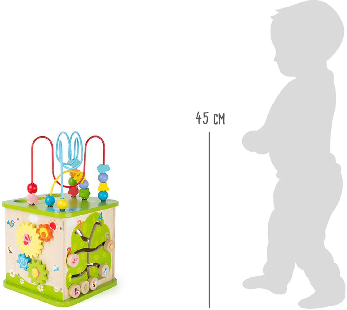 The Wooden 5-in-1 Activity Center with Marble Run will instantly become your toddler's favorite toy! Beautifully crafted with sturdy wood construction, bright colors and a cheerful outdoor theme, this classic 5-sided interactive toy with bead maze, marble run, spinning flower gears, tree puzzle and shape sorter will help develop kids coordination and motor skills. Train your child to perceive shapes and colors as they push and pull the beads along the tracks. Peak their curiosity with the spinning flower wheels and tree puzzle as they move the butterfly, bee, and lady bug pieces along. Activity center features 3 large wooden balls in primary colors for children to drop into the holes and watch them roll through the maze. The removable lid can be stored inside the cube when you need to save space. Activity Center measures 17" H x 10" W x 10" D.