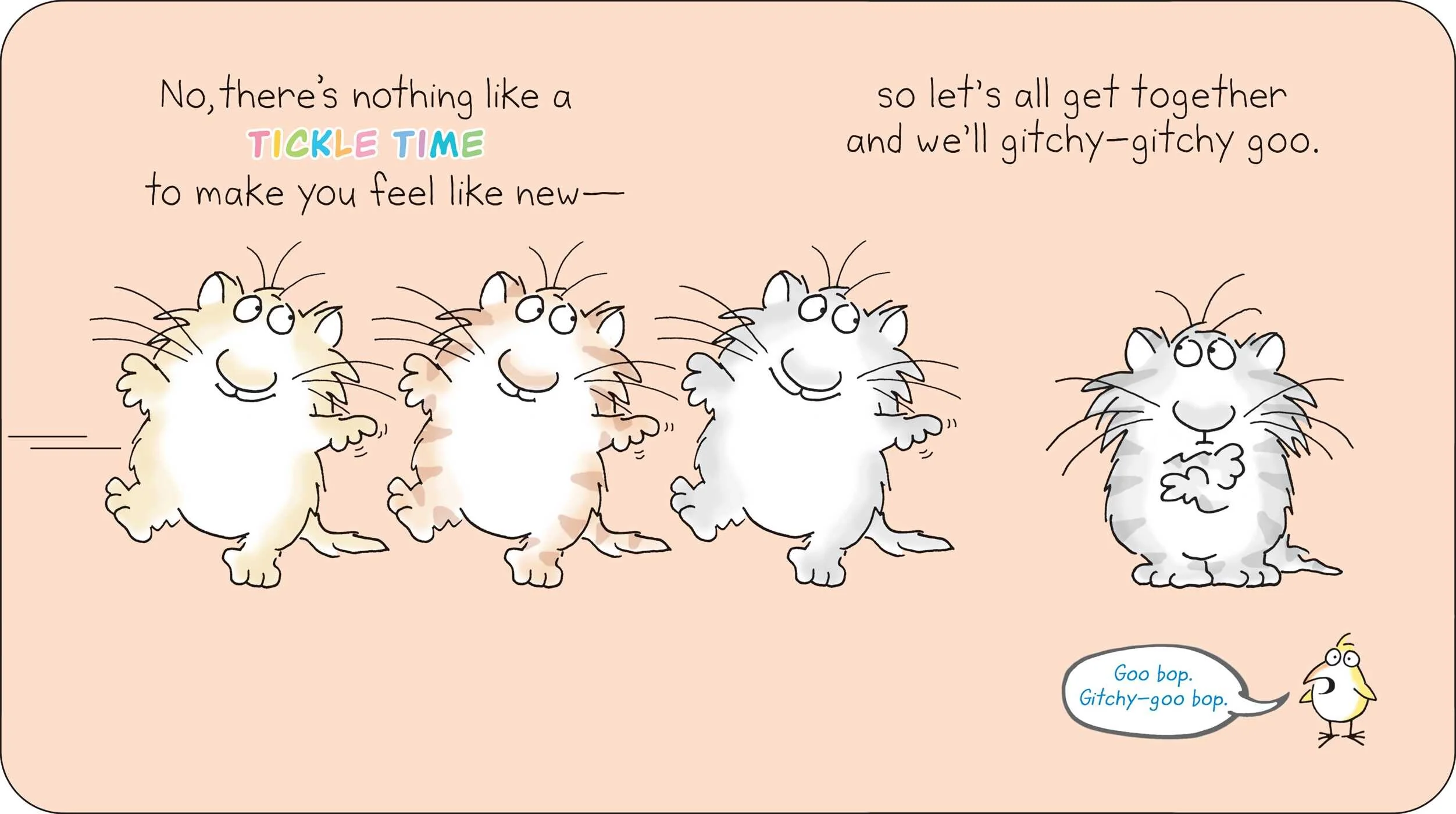 Based on the wildly popular song from Boynton’s wildly popular Rhinoceros Tap book and CD set, Tickle Time! is pure irrepressible Boynton: lively in tempo, nimble in rhyme, and filled with irresistible fuzzy cats that cavort from page to page. Plus a few birds, who aren’t the cavorting type. Here’s a book guaranteed to elicit giggles. GOTTA GITCHY-GITCHY GOO!