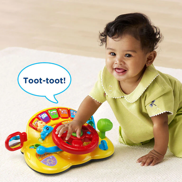 Drive into learning fun with the Turn and Learn Driver. Your little one will love pretending to drive using the steering wheel that causes the cute dog character to move back and forth. Press the five colorful buttons and your child will be introduced to different animals and vehicles. The fun car design encourages imaginative play with a traffic light, a signal lever that triggers fun sounds and music and a gear shifter that pushes and pulls to introduce opposites. The toy car also has three play modes so your little driver can learn in animal, driving and music mode.