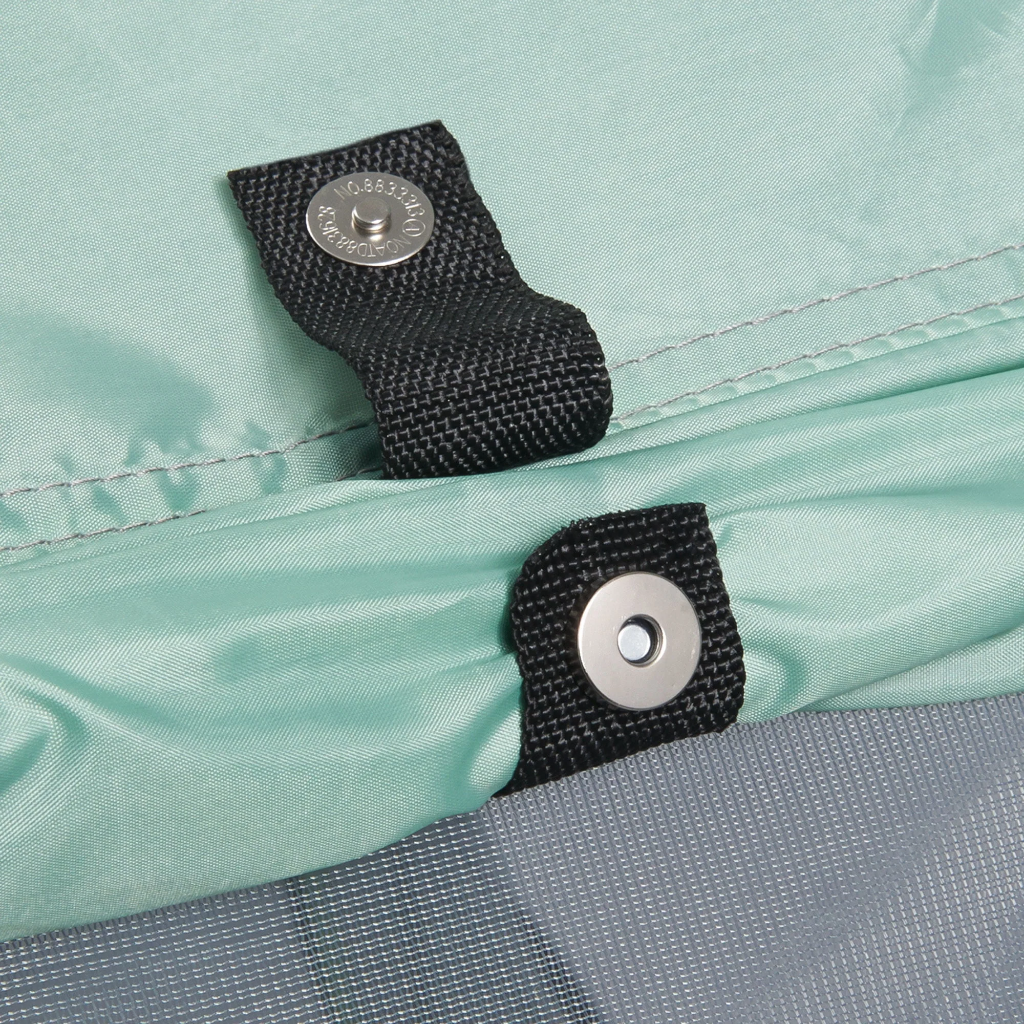 Zippered mesh opening and push lock Internal storage pockets 3/4 sun shades with magnetic closure 50% UV protection Mesh sidewalls for air flow, visibility, and to act as an insect net Designed with more head room so your child can comfortably use it at an older age Sleeping pad snaps under the floor for comfortable play or sleep Automatically pops open for use and quickly folds up to store in its own storage bag Steel frame - 5% polyfiber mattress, 88% fire-resistant poly
