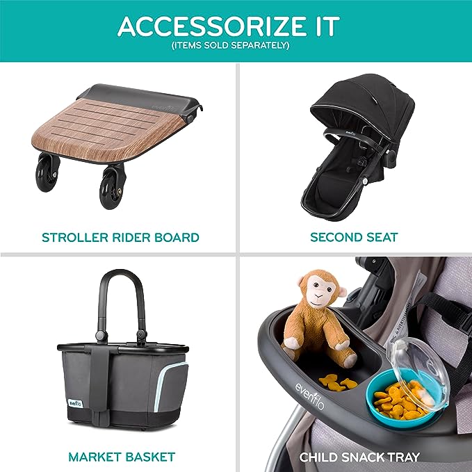 - ACCESSORIZE IT: Stroller is compatible with the Evenflo Stroller Child Snack Tray with Snack Cup, Stroller Rider Board and Infant Car Seat Adapter, and the Pivot Xpand Stroller Market Basket (all sold separately)