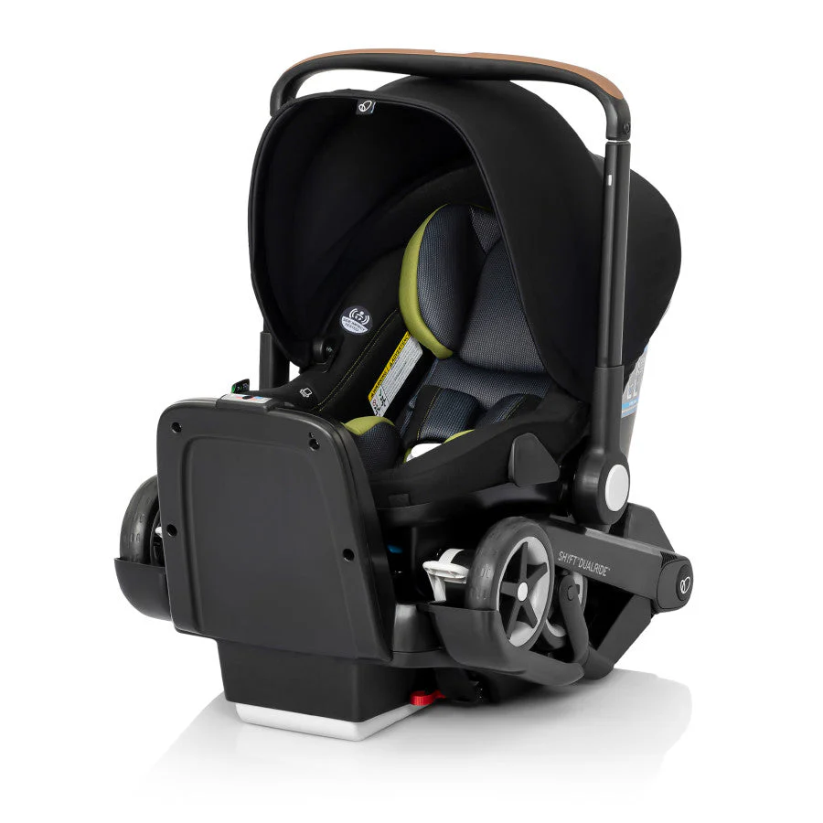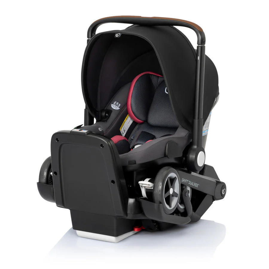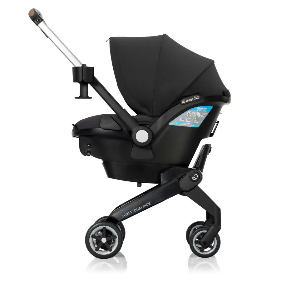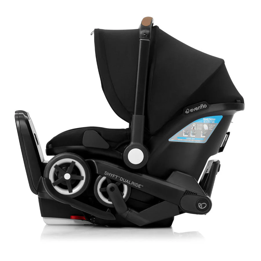 Shyft into life with a newborn! The Evenflo® Shyft™ DualRide™ with Carryall Storage Infant Car Seat and Stroller Combo is a single piece of baby gear that Shyfts from infant car seat to stroller in one step, streamlining life on the go. Moving from car to sidewalk? Simply lift the carrier off the base, release the wheels and you’re rolling in no time. From backseat to street in a heartbeat! Maneuvering stairs? Retract the wheels, carry up/down steps, pop the wheels back down and stroll on. No struggling with multiple pieces of gear. No disturbing your little one. This car seat stroller combo makes every trip easier. While researching the best car seats for your little one, consider this: DualRide’s anti-rebound base absorbs and dissipates crash forces to provide additional stability and give you peace of mind, so you can make the Shyft with confidence. Designed for infants as small as 3 lb and up to 35 lb, who measure from 15.7 in. to 32 in., this infant car seat and stroller in one comes with a no-rethread harness that adjusts to 8 positions to grow with your child. Thoughtful design places the infant carrier on the stroller higher, so your baby’s sweet face is always near. You’re looking for a safe infant car seat — and the smart car seat is a connected car seat. With SensorSafe™ to connect you to your little one from the backseat, the DualRide is the savvy choice when it comes to child car seat safety. In car seat mode, DualRide’s integrated SensorSafe technology alerts you in real-time to 4 potentially unsafe conditions from your child’s car seat via Bluetooth: unexpected chest clip unbuckling, temperature too hot or too cold in the car, child unattended in the car, and child seated too long. LockStrong™ Installation and Quick Connectors provide solid, secure installation in no time. This stroller car seat combo provides a full-coverage canopy to block rain and snow, with UPF 50+ to protect your baby against the sun. With the DualRide stroller and car seat combo, the extras aren’t extra! A removable carryall storage bag and removable parent cupholder are included. Another plus: Wheels nest securely in the base wheel wells in your vehicle, so you can take just the carrier into your home without tracking in dirt. To finish it off, DualRide’s sophisticated silhouette, washable padding and well-considered touches ensure you’ll make the Shyft to new parenthood in style. Shyft into action, effortlessly!