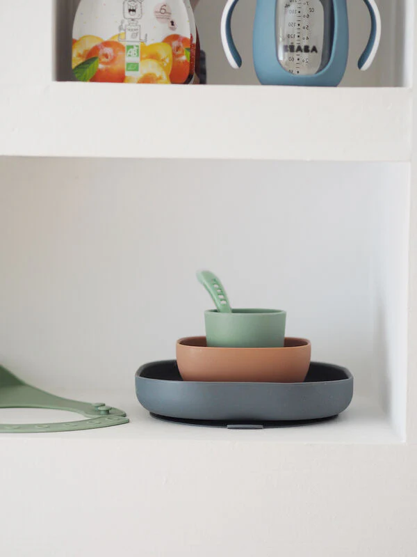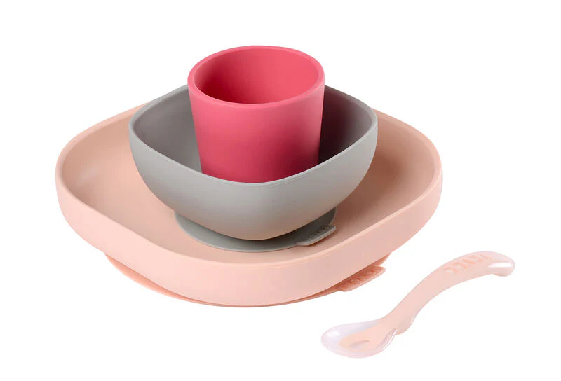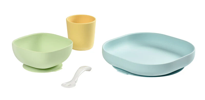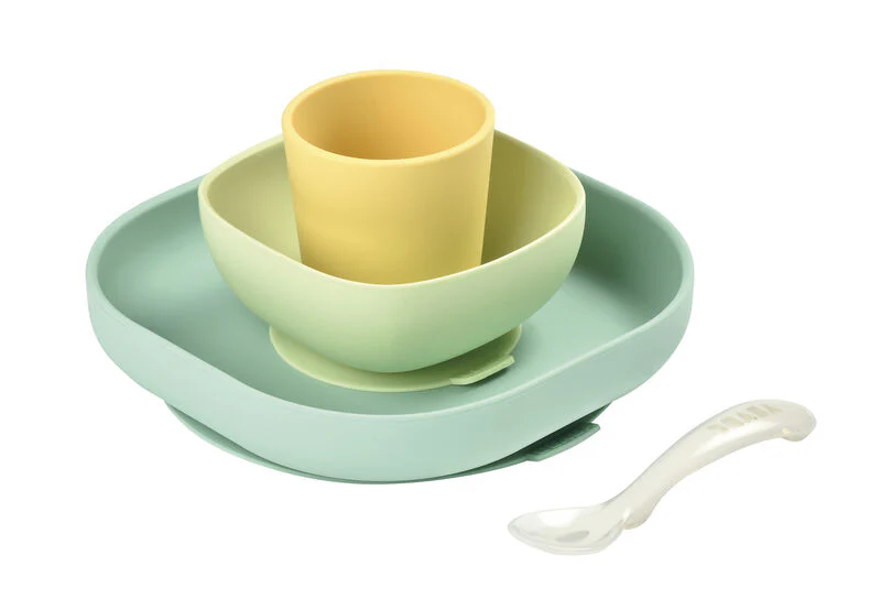 The BEABA 4-Piece Silicone Suction Meal Set helps encourage little ones to eat independently. Plate and bowl feature suction bottoms so they stay put on the table, and the cup and spoon are ergonomically designed to perfectly fit in petite hands.