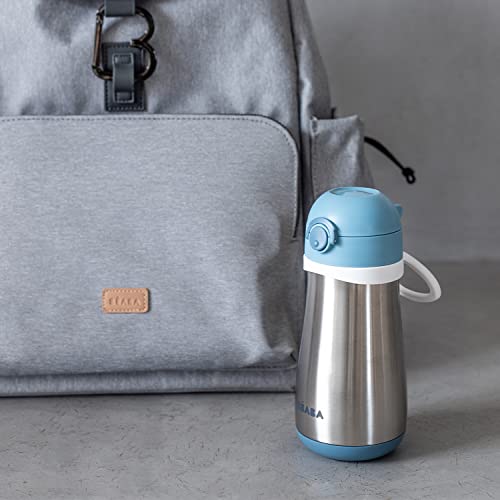 - BEABA stainless steel water bottle made for children 18+ months learning to drink directly from a bottle. Spout makes drinking easy, similar to a glass.