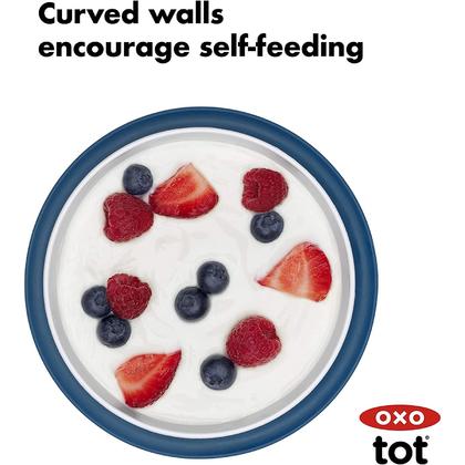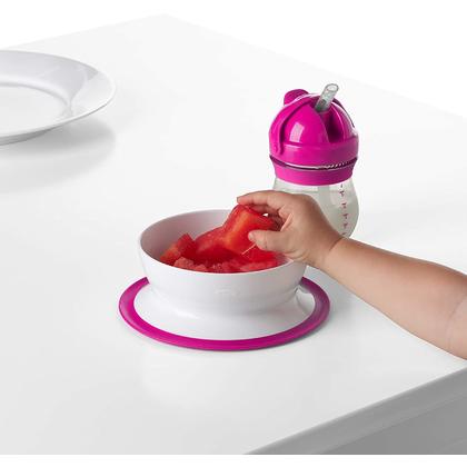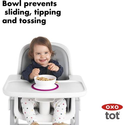 Cut down on mealtime mess with the OXO Tot Stick & Stay Suction Bowl. The Bowl features a suction base that sticks securely to surfaces until mealtime is over, preventing sliding, slipping and tipping. The parent-friendly opening makes removing the Bowl simple for adults, but tough for tots. Tall walls allow for easy scooping and encourage self-feeding. Twist the Bowl and base apart for quick cleaning in the dishwasher.