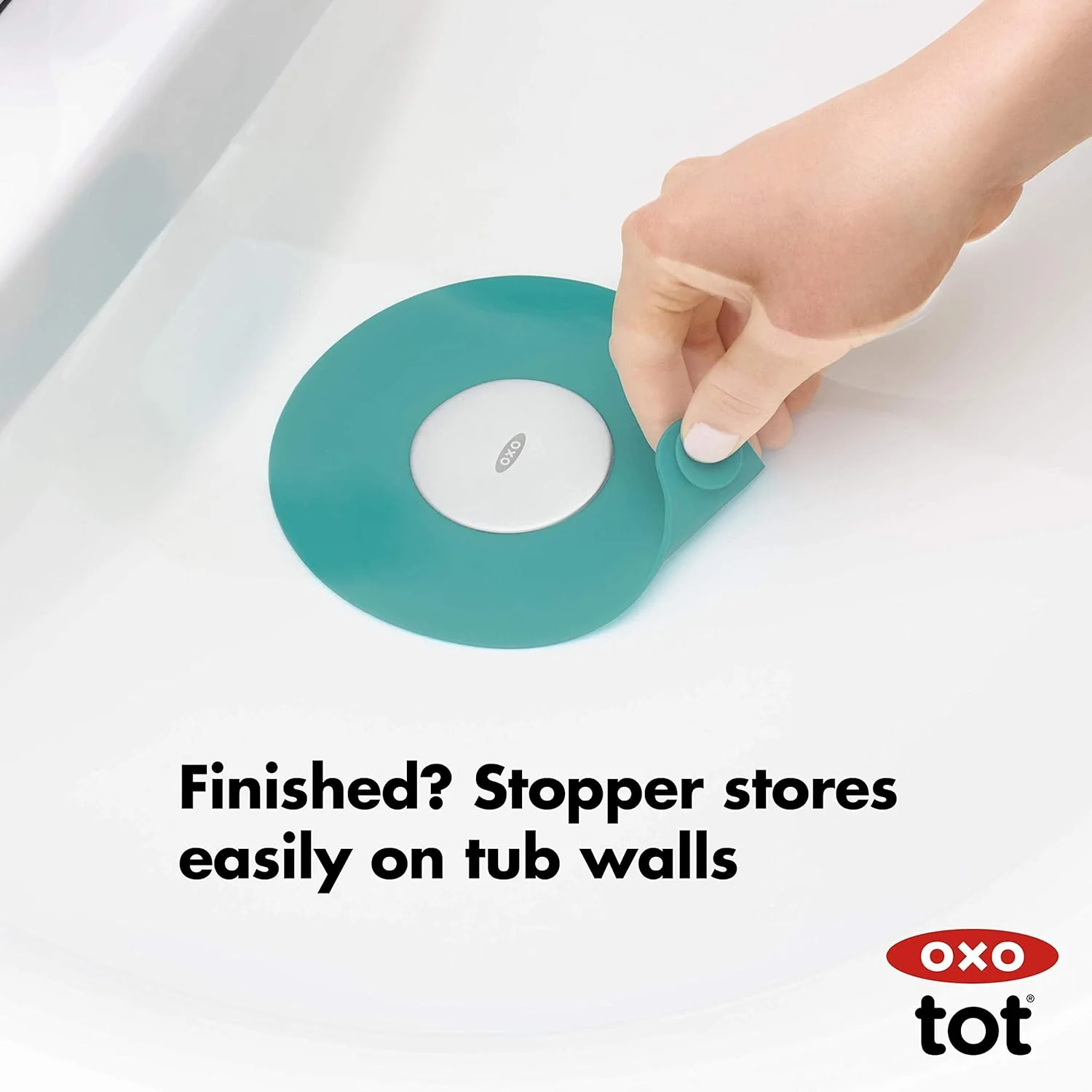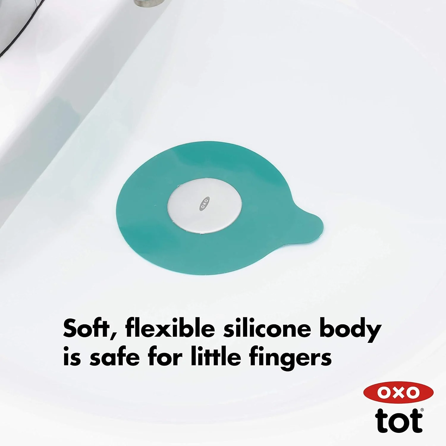The OXO Tot Tub Drain Stopper keeps water in the tub during bath-time. Soft, flexible silicone makes it safe for little fingers, and a suction cup secures the Stopper to the tub floor with a water-tight seal, keeping water (and toys) from escaping down the drain. When the Stopper is not in use, the suction cup is convenient for storing the Stopper on the wall.