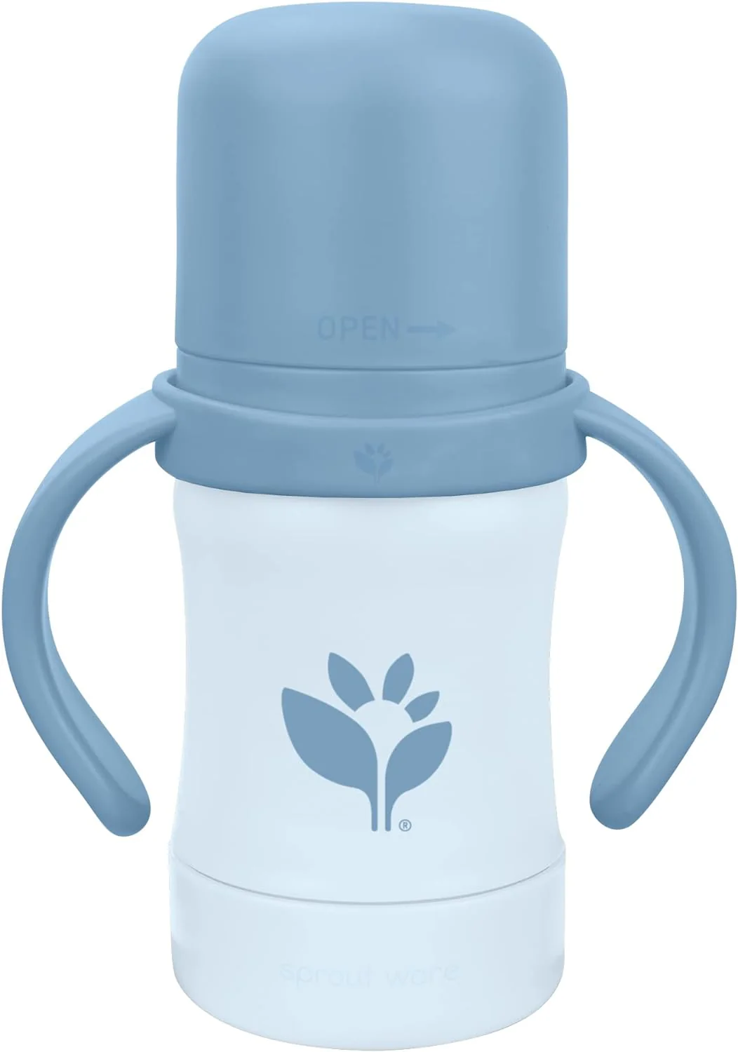 Keep your little one sipping safely throughout development stages with our green sprouts® Sprout Ware® Sip & Straw. Our innovative Sprout Ware® plant-plastic is a non-toxic, lightweight, durable, and recyclable material made without PVC and hormone disrupters like BPA for baby’s health and safety. Safer materials reduce the risk of chemical leaching—with our non-toxic straw sippy cup, liquids touch only Sprout Ware® plant-plastic and 100% platinum-cured silicone. The soft sippy spout made from food-grade silicone allows baby to comfortably sip when transitioning from bottle-feeding and breast-feeding, and drip-free spout only releases liquid when pressure is applied to avoid spills. As your little one grows, the straw spout encourages proper oral development, and the removeable straw allows for traditional or tilted drinking positions.  The contoured design and removable handles are easy to grip, hold and tilt while learning. A wide neck and removable base make this non-toxic sippy cup easy to clean by hand for longevity, but all parts are dishwasher safe. Made with love for little ones 6 months and up and holds 6 ounces (177 ml) of liquids. Our training cup has interchangeable parts with other green sprouts® bottle and cups, including spouts, collar, and bases, for convenience and to grow with baby for a longer product lifespan.
