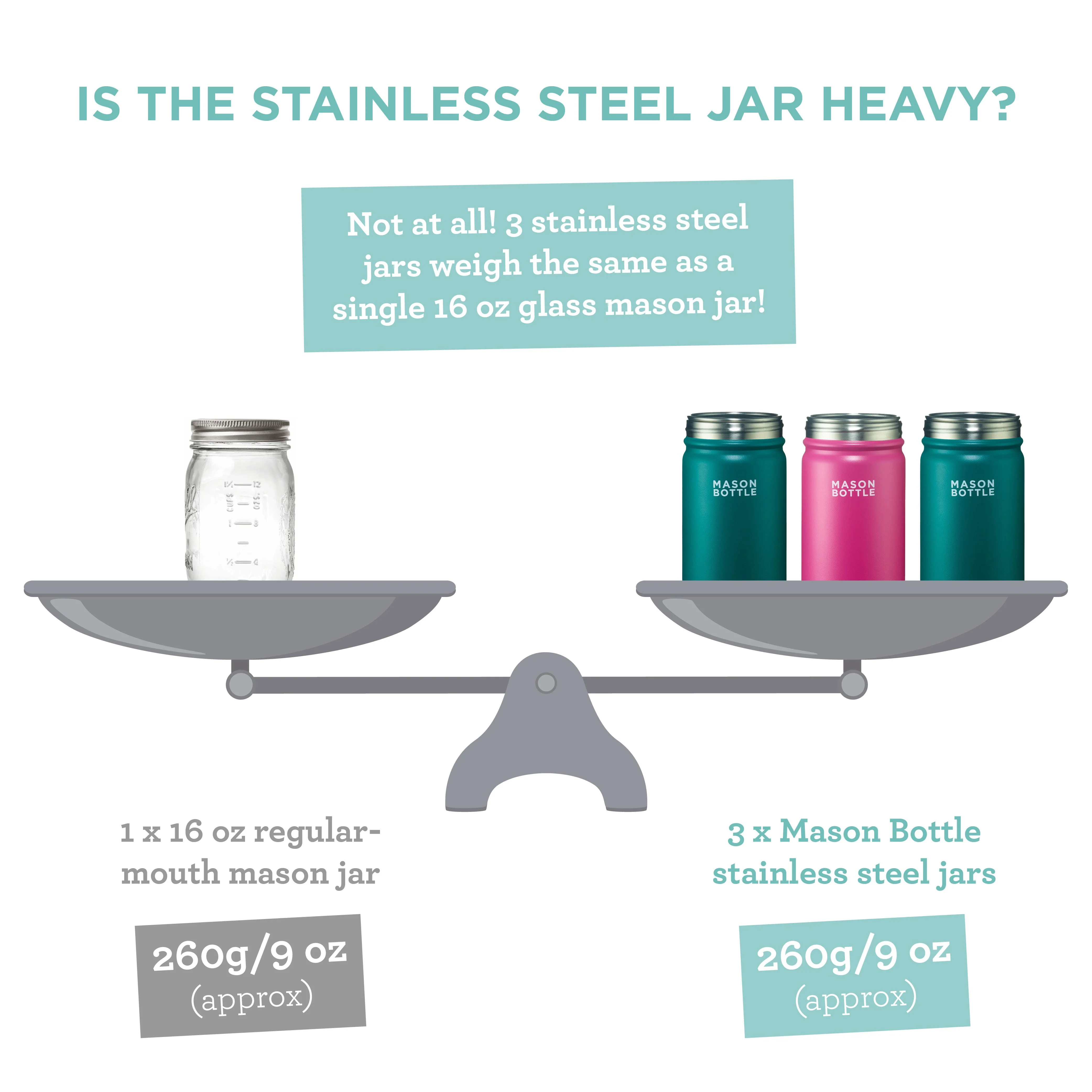 The perfect eco-friendly alternative to traditional glass jars. Made from high-quality stainless steel, this mason jar is versatile, non-toxic, and toxin-free -- making it safe for your little one! Our stainless steel mason jar weighs only 3 ounces, three times less than the 16 oz glass mason jar.