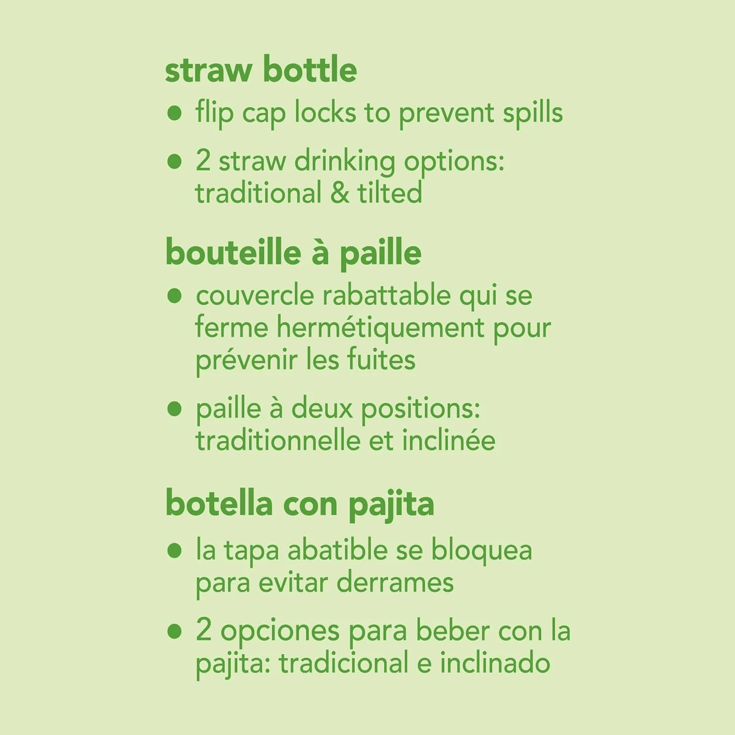 - 2 straw drinking options: traditional and tilted