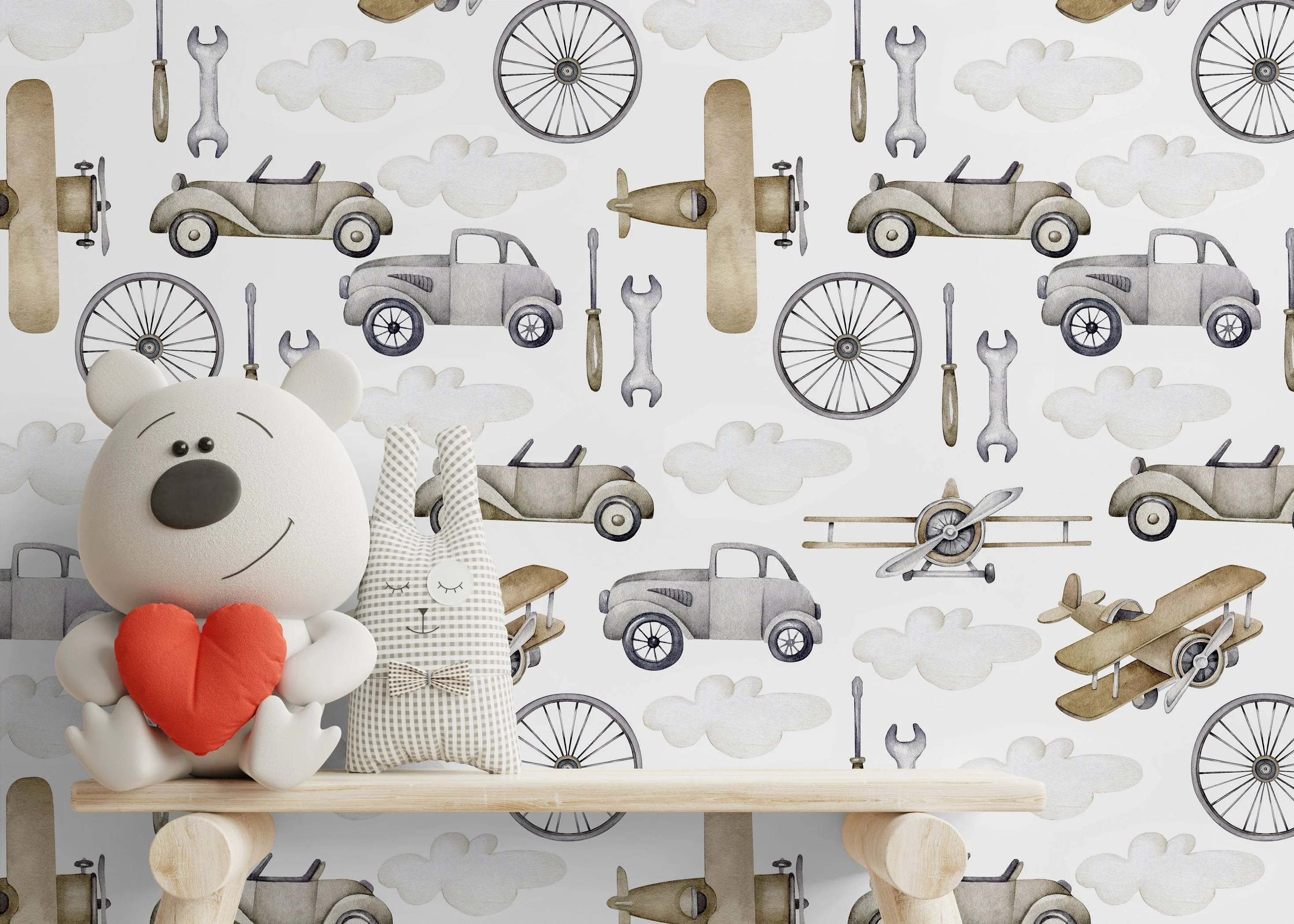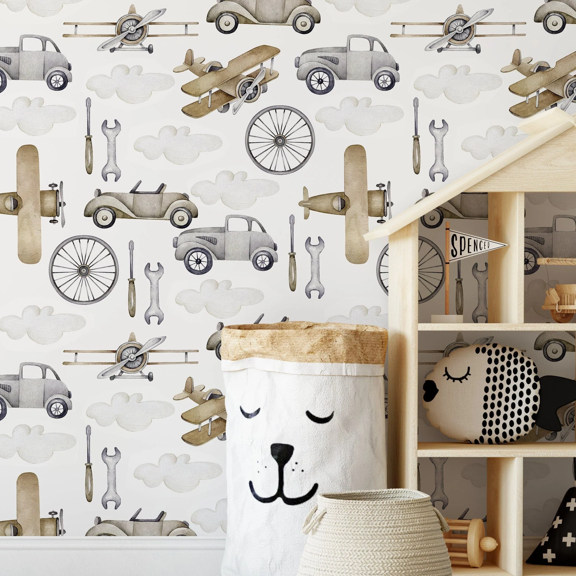 Ondecor Neutral Airplanes and Cars Peel and Stick Removable Wallpaper Room Decor - D528