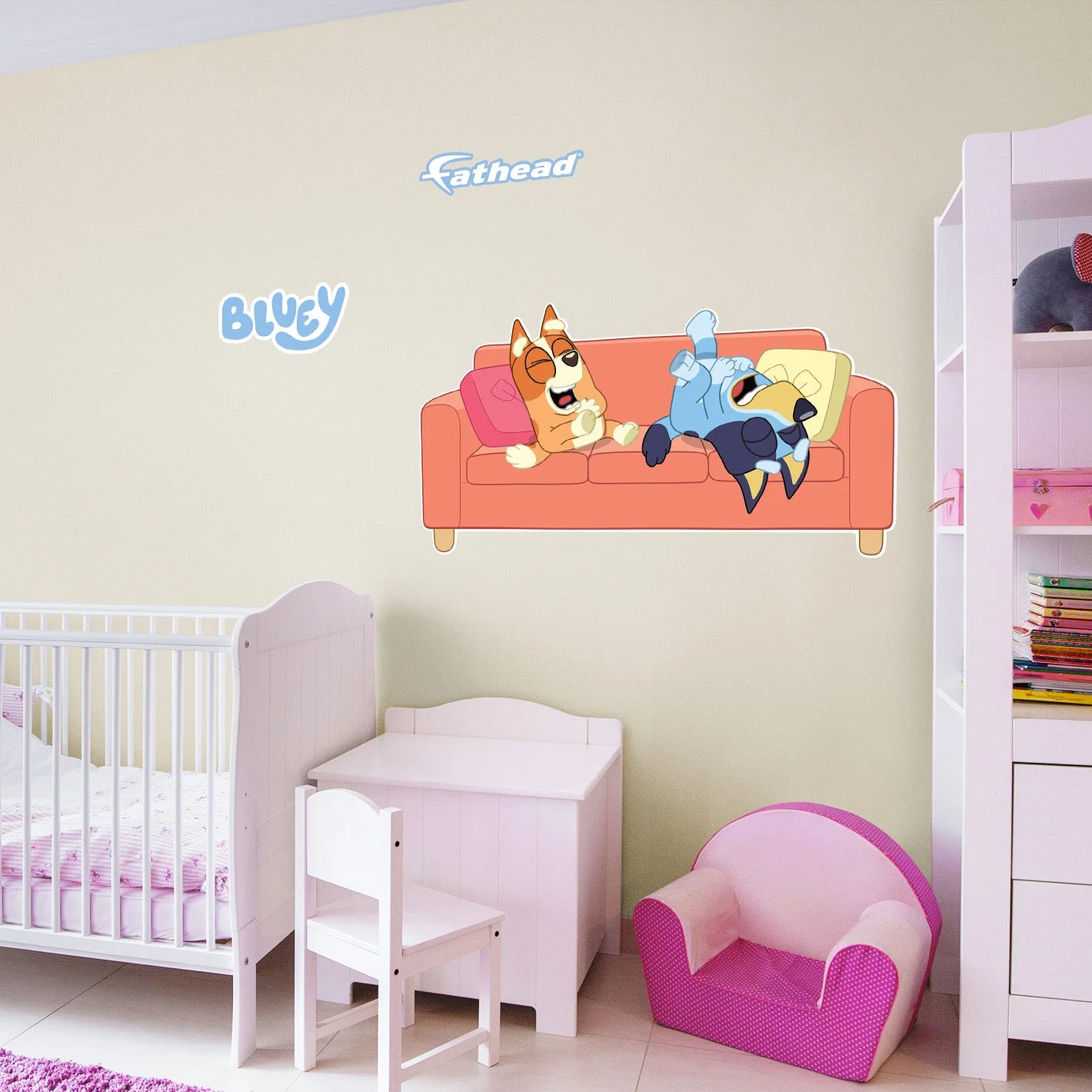 Fathead Bluey: Bluey & Bingo Sisters Laughing on Couch Icon - Officially Licensed BBC Removable Adhesive Decal