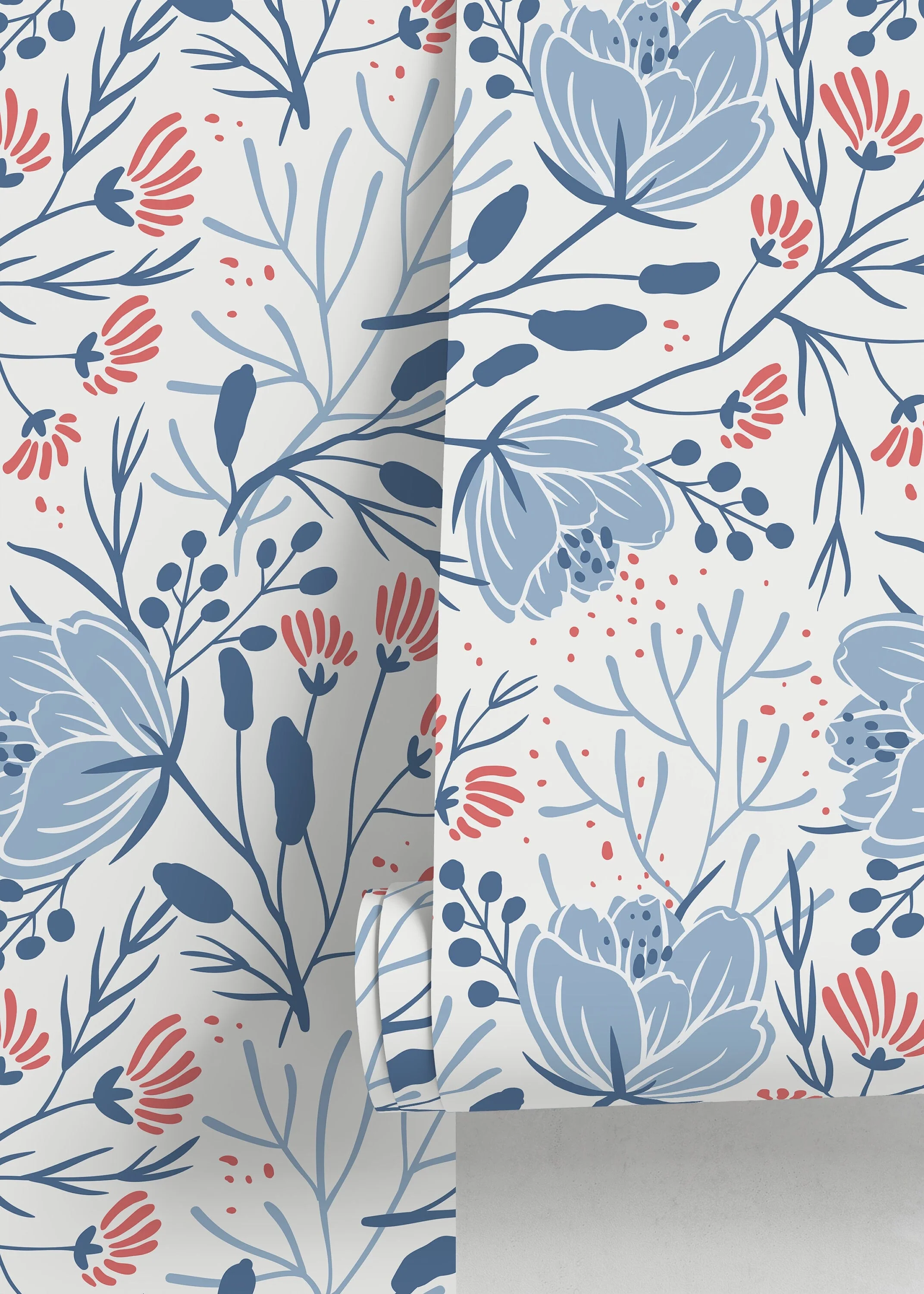 Ondecor Blue and Red Floral Peel and Stick Removable Wallpaper - D396
