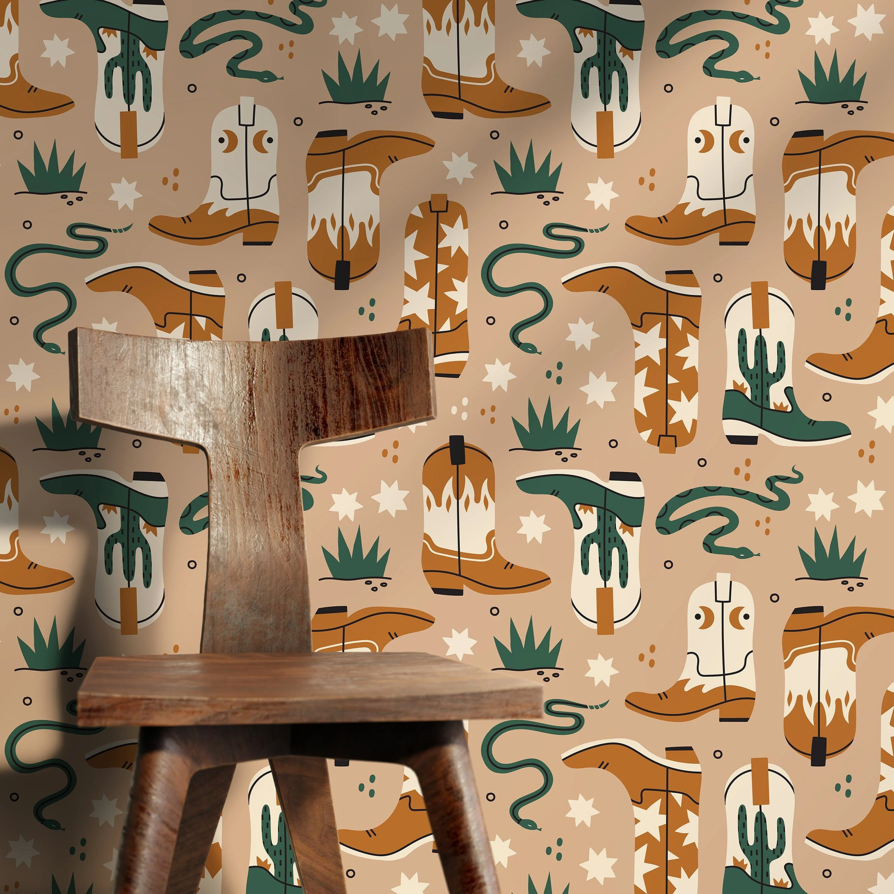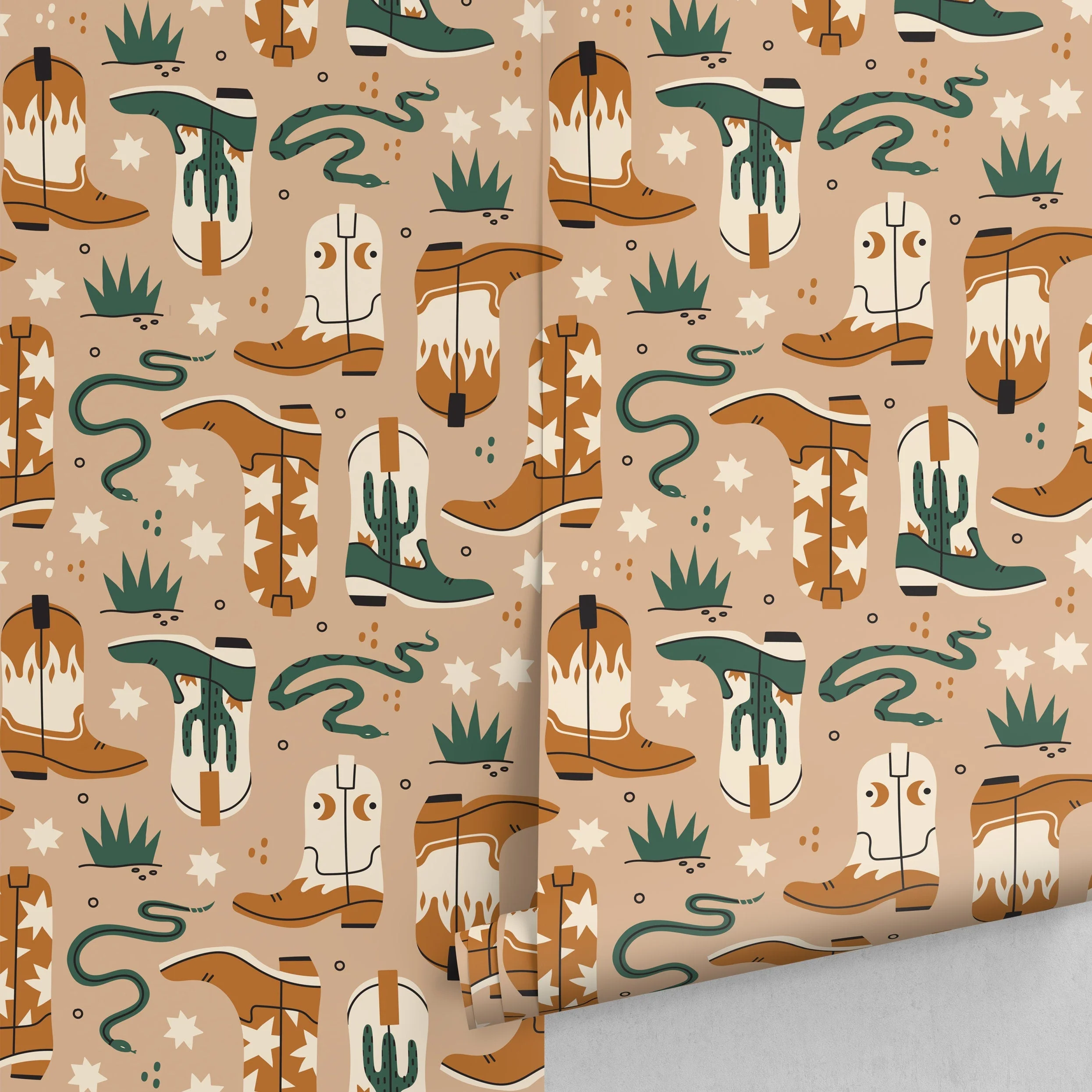 Ondecor Beige Cowboys Boots and Snakes Peel and Stick Removable Wallpaper - C704